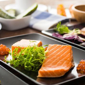 Smoked kipper salmon, which is split, salted, and smoked, features a rich, robust flavor that blends smokiness and saltiness, with a deep savory profile and hints of sweetness depending on the salmon type. Its texture is firm and meaty, with a flaky consistency that maintains substantial thickness; the smoking creates a slightly drier exterior while keeping the interior moist.