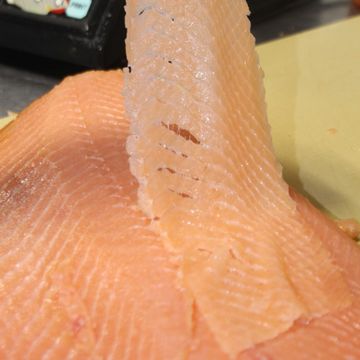 Hand-sliced smoked salmon Scotch style offers a robust and pronounced flavor that is rich, smoky, and slightly salty, with subtle notes of sweetness. Its texture is firm yet tender, with thick, meaty slices that provide a satisfying bite.